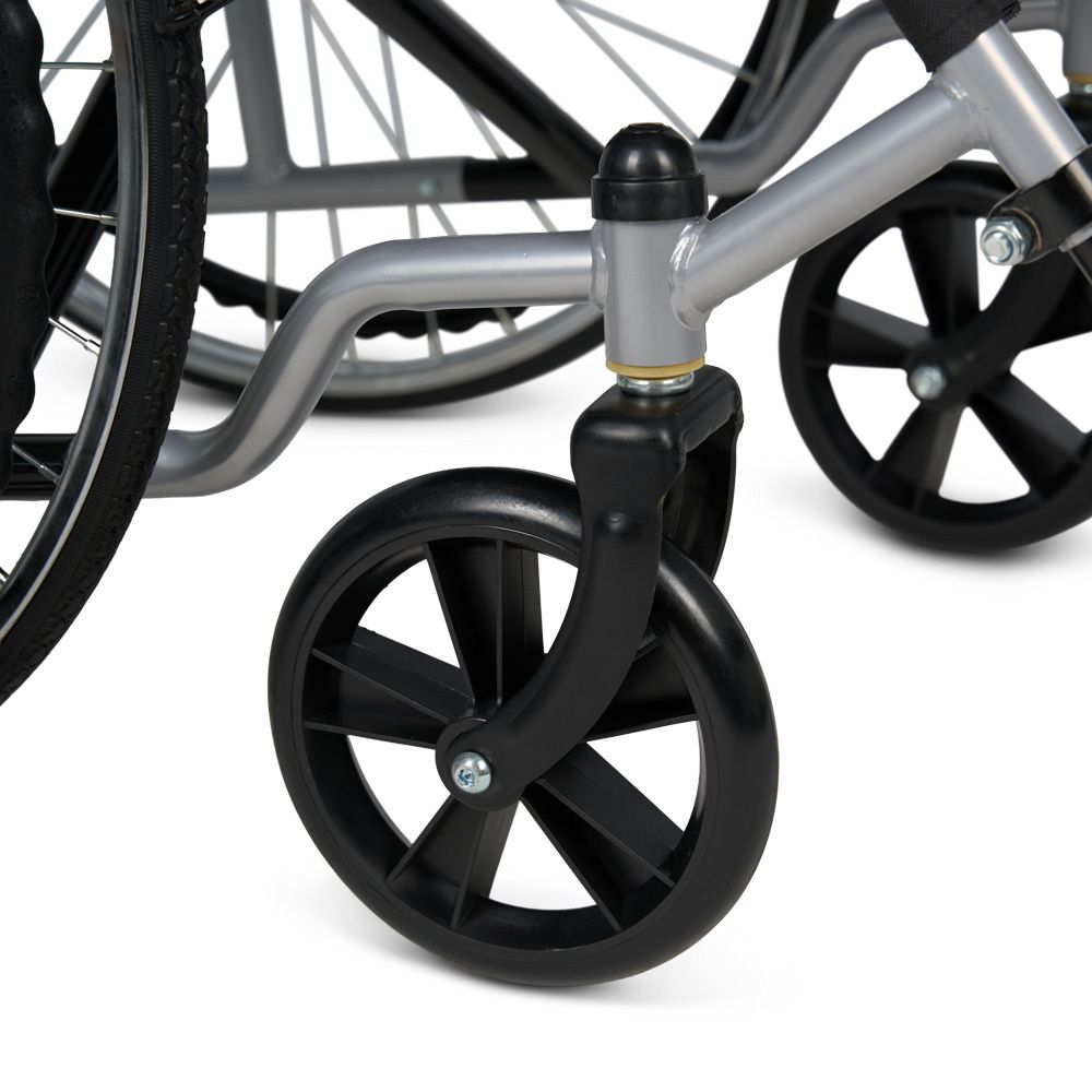 Манёвренные передние колёса облегчают управление коляской. Их литые шины прочны и не требуют специального ухода и ремонта.
